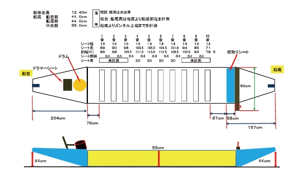 チャンピオンの艇計測図(船体全長、船高、シート幅、シート間隔など)をご覧いただけます。